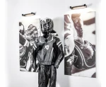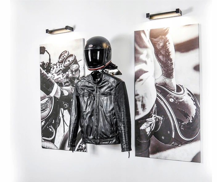 Solidny wieszak wykonany ze szczotkowanej stali nierdzewnej. Całość ułatwia przechowywanie kompletu motocyklowego. Zawsze suchy, zawsze świeży i świetnie wyeksponowany zestaw podkreśli pasję do motocykli.